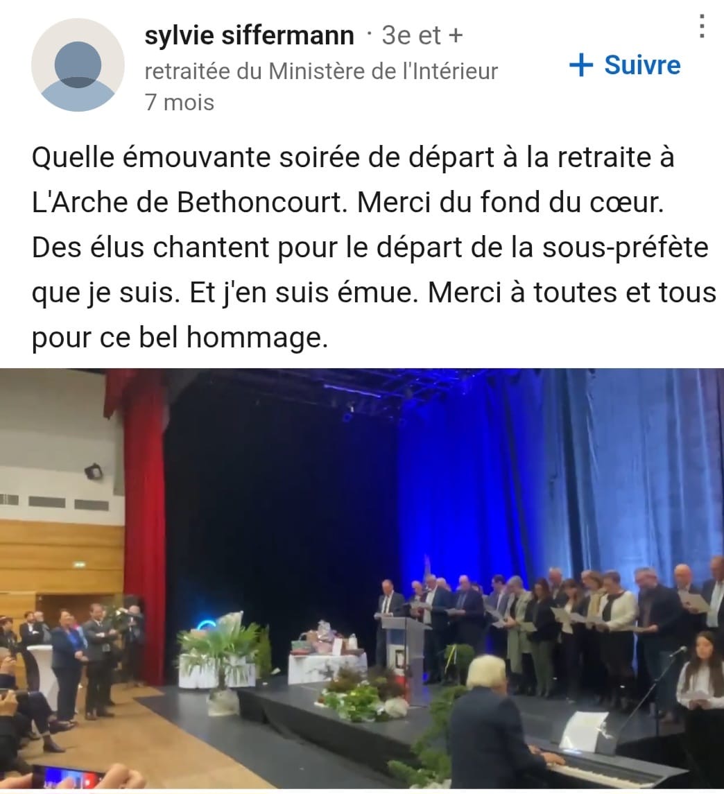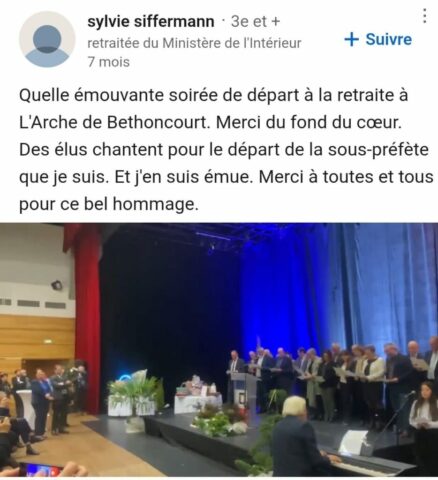 A NOTER : pour la « petite histoire », le 20 février 2025, « OUVREZ L’BEC » a animé la soirée de départ de Madame la Sous-Préfète Sylvie SIFFERMANN, en faisant chanter un groupe d’élus à l’Arche de Bethoncourt… Un moment fort en émotions.