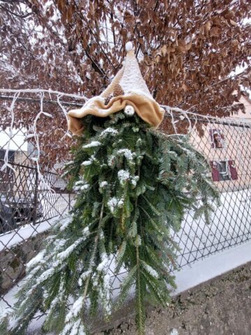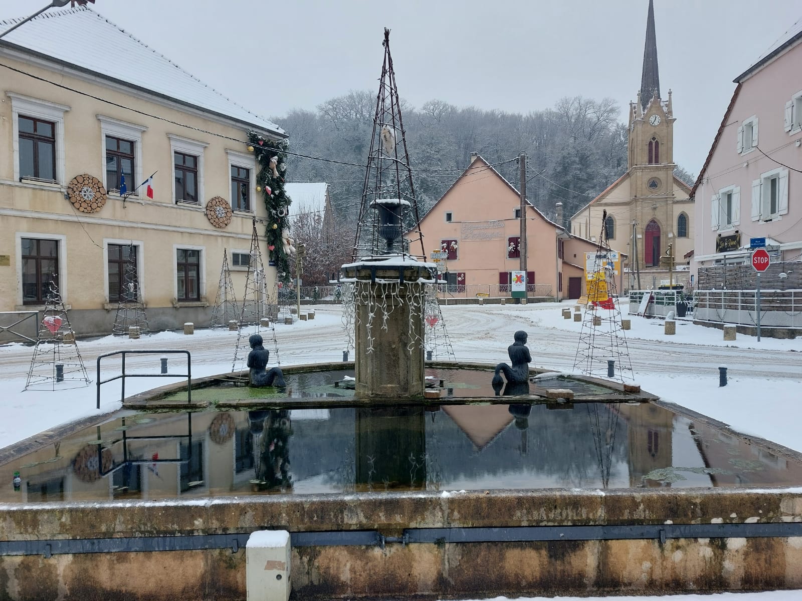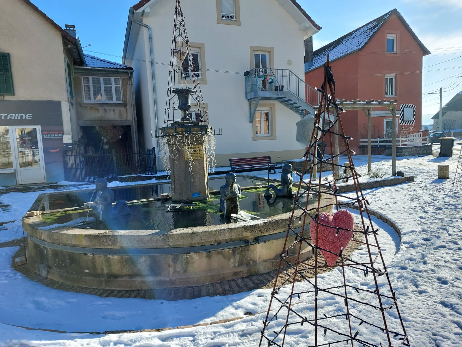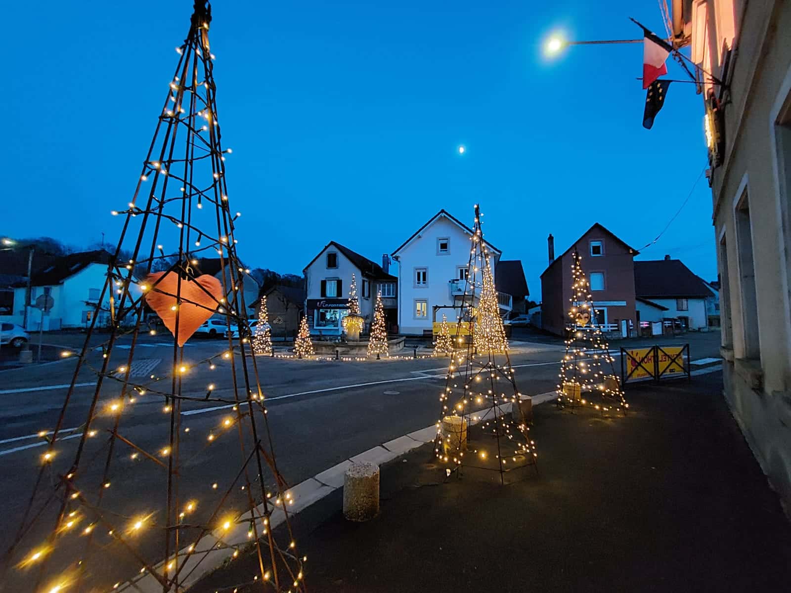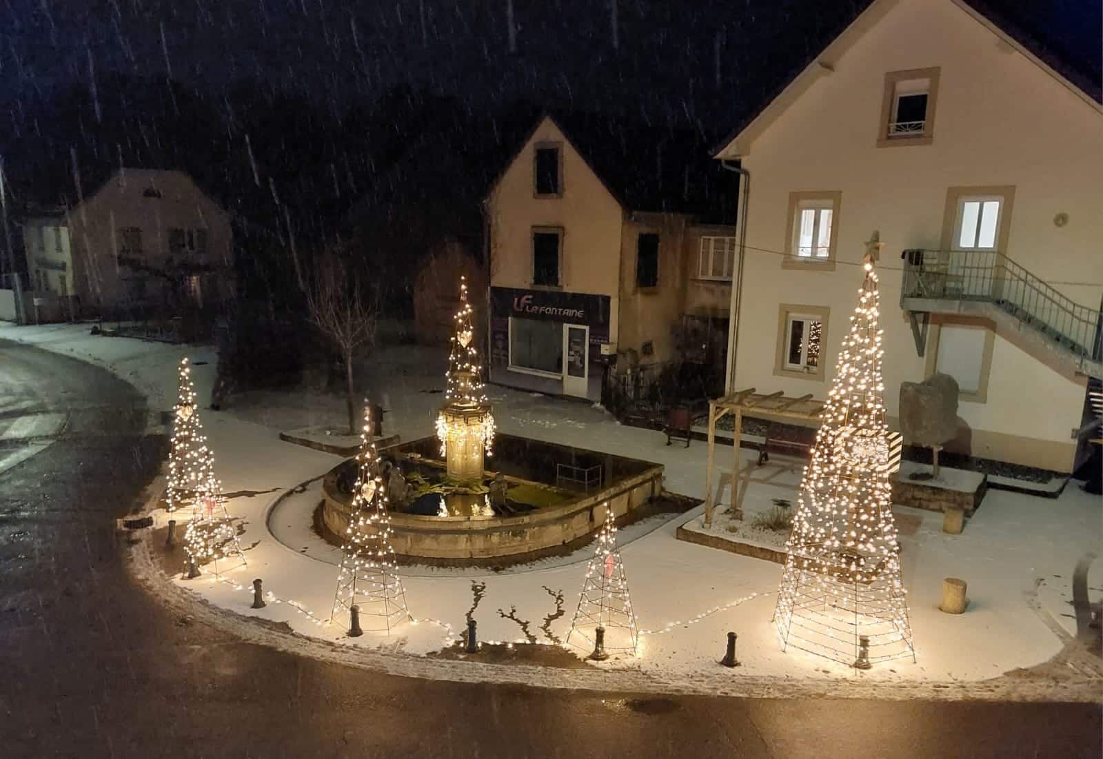 Outre le troupeau de rennes de l’entrée rue de Brognard, et la « Chorale des Pères Noël » en face de la rue des Roches, c’est un majestueux sapin en structure métal qui a trôné au centre du village, lui aussi fruit du travail de nos agents. Réalisé en plusieurs parties assemblées, il illuminait le parvis de la Fontaine des Sirènes.