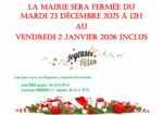 Le secrétariat de mairie sera fermé du mardi 23 décembre 2025 à 12h au vendredi 02 janvier 2026 inclus Vous pouvez (en cas d’urgence) contacter…